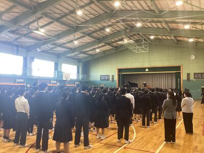 体育館で行われた始業式は、全校生徒による校歌斉唱で幕を開けました。新年の始まりにふさわしい清々しい歌声が響き渡り、学校全体が引き締まった空気に包まれました。