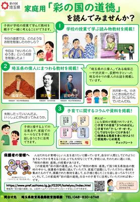 埼玉県では県独自の道徳教材「彩の国の道徳」の活用を通じて、小・中・高等学校の道徳教育の充実を図っています。小・中学校においては、「特別の教科 道徳」を要として、発達の段階に応じた道徳教育の取組を推進するとともに、家庭用「彩の国の道徳」を活用し、家庭・地域・学校が連携した道徳教育を推進しています。詳しくは家庭用「彩の国の道徳」保護者用リーフレット.pdfをご覧ください。