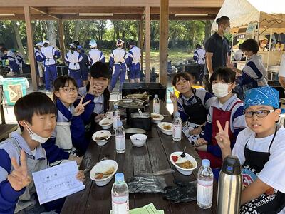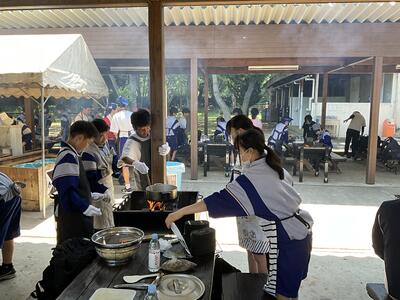 午前中は、飯盒炊さんでカレー作りに挑戦しました。班ごとに協力して、火を起こし、ご飯を炊き、カレーを作りました。最初はうまく火がつかずに苦労していた班もありましたが、協力して取り組むうちに、だんだんと上手に火を起こせるようになりました。カレーが完成すると、みんなで美味しくいただきました。自分で作ったカレーは格別だったようで、生徒たちは笑顔で「おいしい!」と声をあげていました。