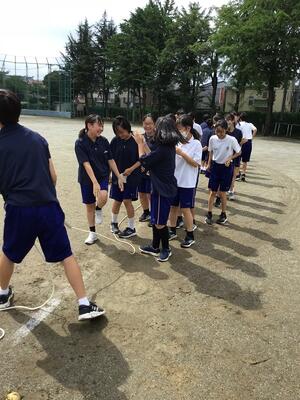 しっかりと準備体操を行った後、大縄跳びの練習を行いました。クラス全員で息を合わせて跳ぶことが求められるこの競技は、チームワークがとても大切です。生徒たちは最初はタイミングが合わず苦労していましたが、先生の指導のもと徐々にコツをつかむことができました。